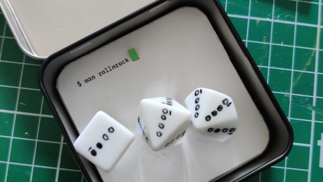Roll and Rock is a tin box containing three dice and a manual printed on a piece of paper. It doesn’t require the internet or any other connection. Everything is in that little box.