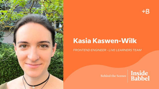 I’ve been at Babbel for around a year and a half. I started as a junior frontend engineer and I was promoted to mid level professional engineer about three months ago. And my background is actually in music, I have a degree in opera and acting. I speak Polish, English, German, and a bit of Dutch.